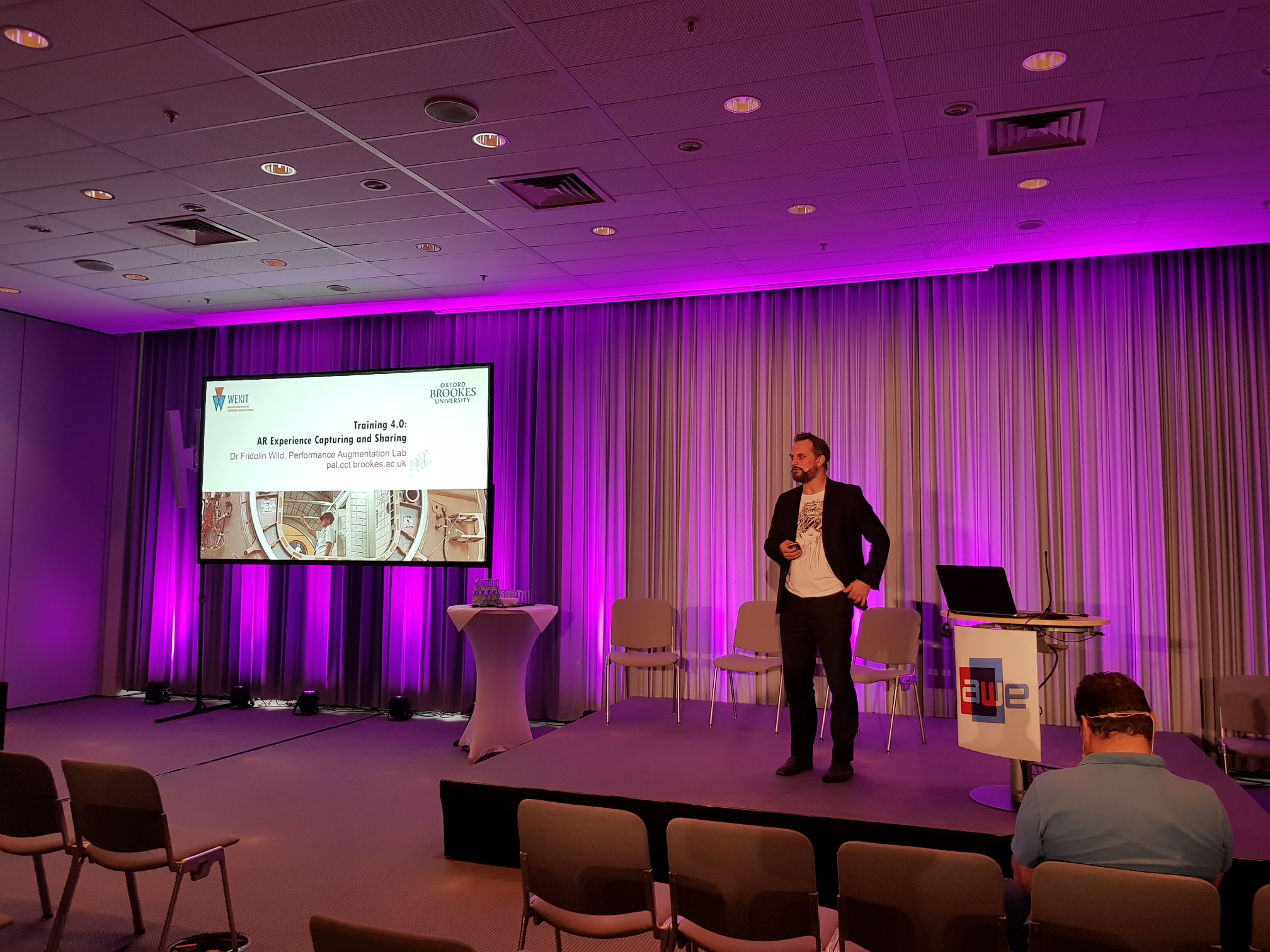 At the Augmented World Expo in Munich, we have been exhibiting the WEKIT project last week, showcasing the breakthrough achievements for our augmented reality and wearables solution in the space industry, aviation, and medicine. On stand #217, we exhibited the different versions of the e-textile garment (and its underlying sensor harness) as well as the WEKIT.one software solution. The director of our lab, Dr Fridolin Wild, gave a keynote presentation in the enterprise track about AR experience capturing and sharing for Training 4.0, explaining the technologies of the project and the findings of the pilot trials reported so far in a series of articles and papers.